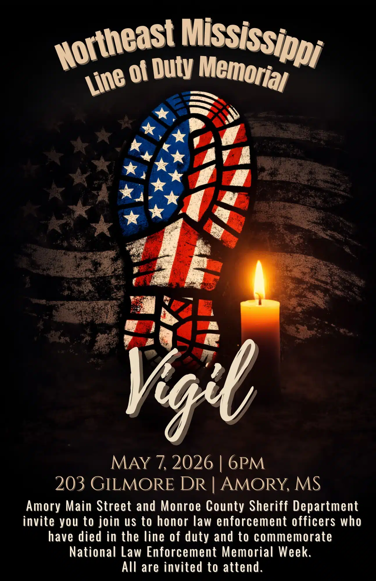 Northeast Mississippi Line of Duty Memorial Vigil | Amory, MS + Add to Google Calendar + iCal / Outlook export 00 days 00 hours 00 minutes 00 seconds Date May 07 2026 Time 6:00 pm More Info Read More Read More Share this event